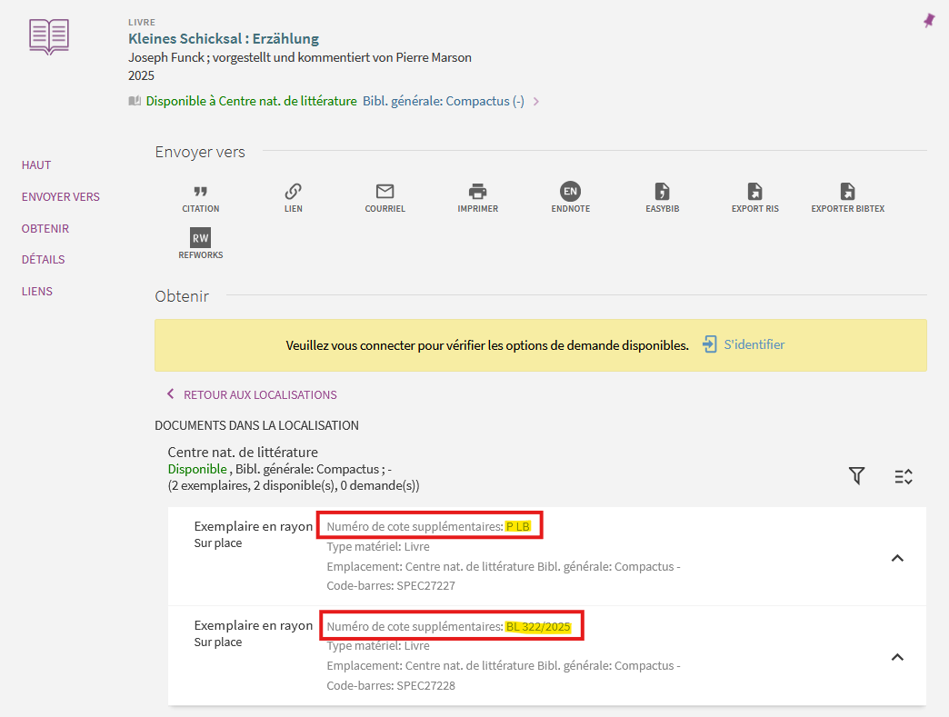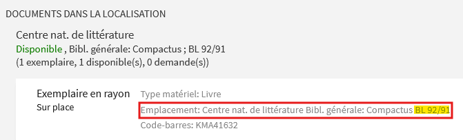 Merci d'indiquer les cotes (et non pas le code-barres) lors de votre demande de consultation de documents. Vous les trouverez sous « Localisations ». Exemple d'un livre: